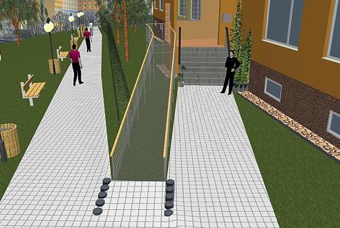 Přístup ke vstupnímu portálu upravujeme jednoúrovňovými chodníky pomocí zámkové dlažby lemované obrubníky nebo jinými betonovými prvky.