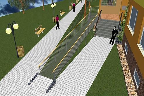 Pro snížení přístupové bariéry provádíme šikmé rampy z ocelových konstrukcí.