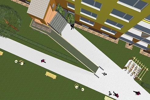 Přístup ke vstupnímu portálu upravujeme jednoúrovňovými chodníky pomocí zámkové dlažby lemované obrubníky nebo jinými betonovými prvky.